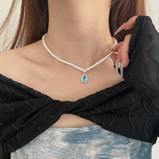 Alloy Blue Zircon Water Drop Pearl Necklace