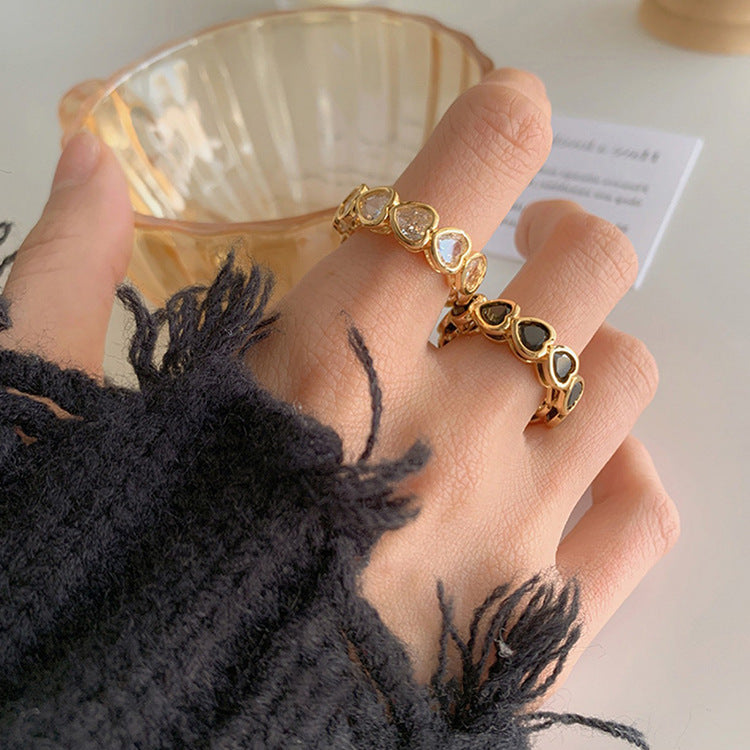 Color: white zirconium love heart-shaped ring plated with real gold, black zirconium love heart-shaped ring plated with real gold